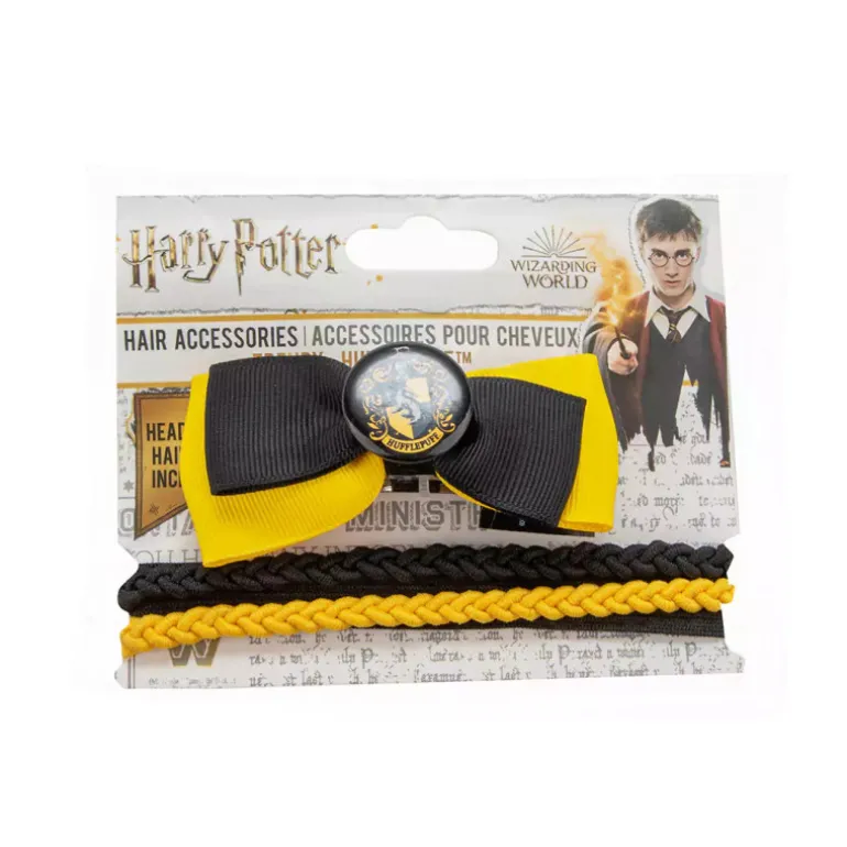 Los Accesorios para el cabello Hufflepuff Trendy están diseñados con el logotipo distintivo de la casa Hufflepuff, con los colores amarillo y negro característicos, lo que lo convierte en un accesorio de moda perfecto para lucir el orgullo de pertenecer a esta casa de Hogwarts.n nEste set de accesorios incluye una diadema, pinzas para el cabello y una cinta para el cabello, todo ello presentado en un packaging especial que hace que sea ideal para regalar.
