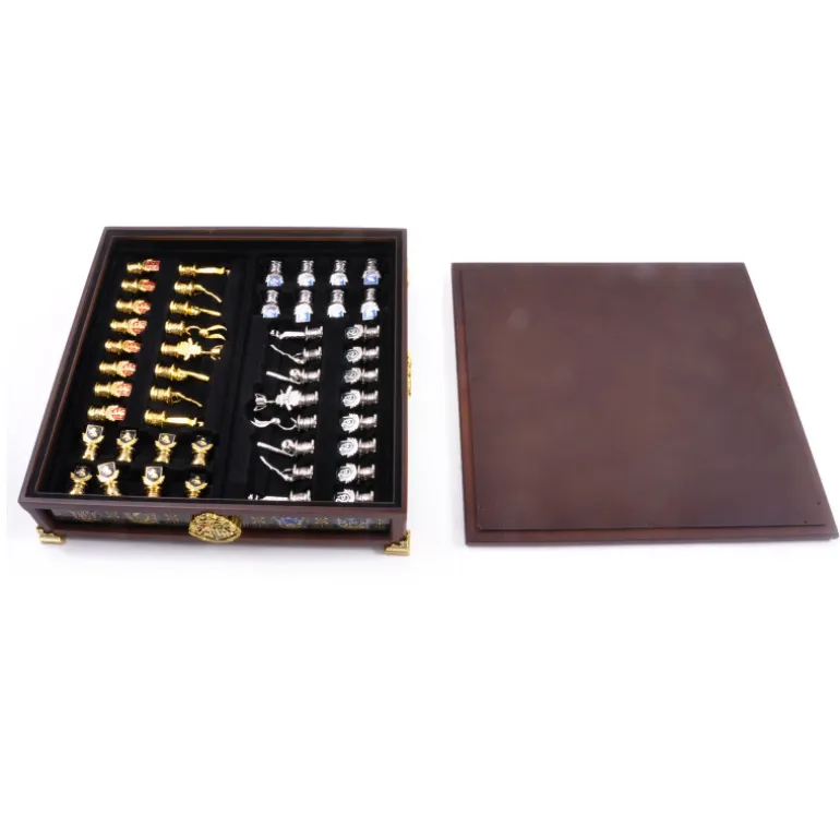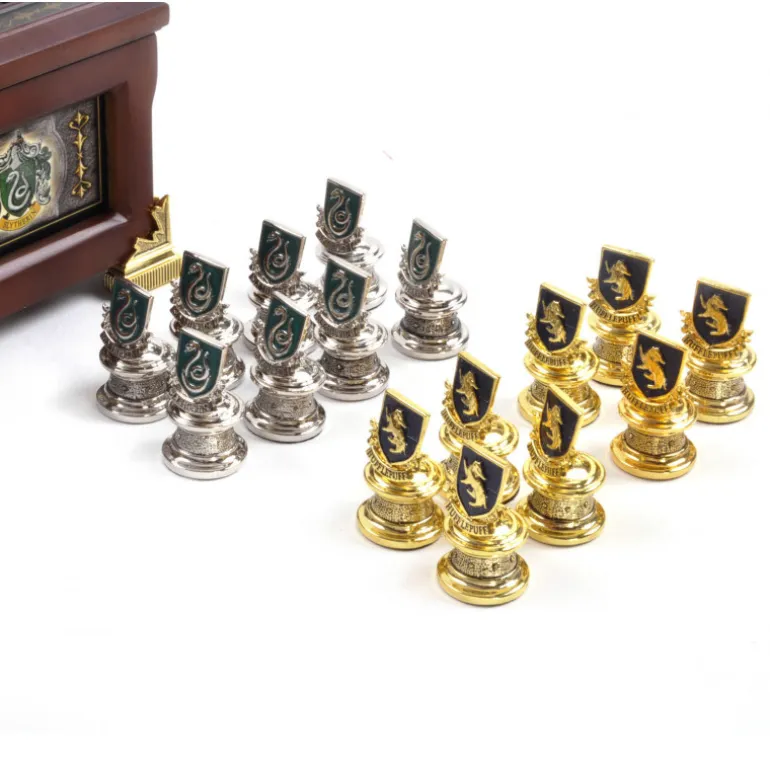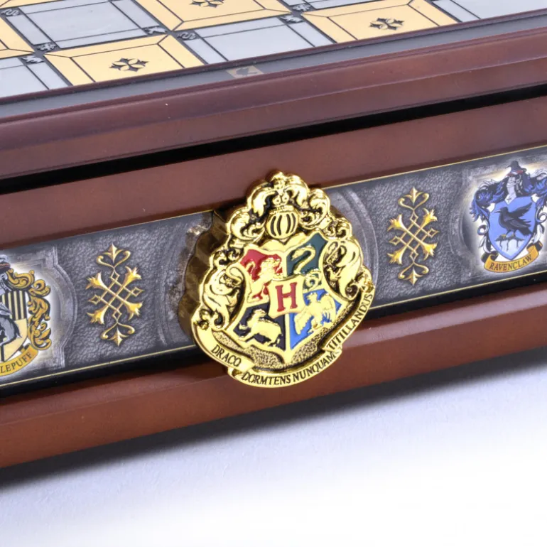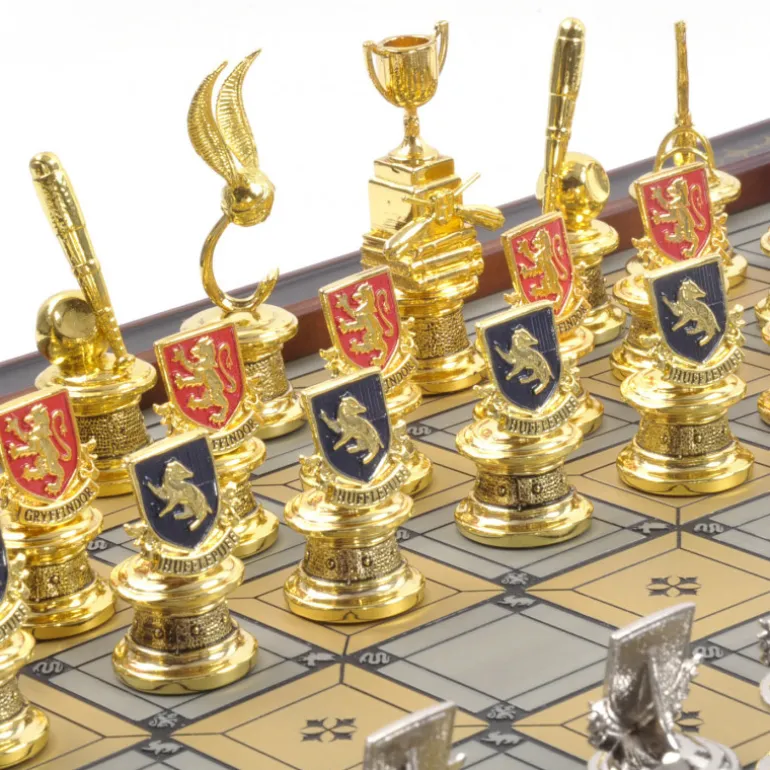 Se trata de un ajedrez de Harry Potter tematizado en los equipos de Quidditch de Hogwarts, realizado en madera con detalles en oro de 24k. El tablero contiene almacenamiento para que guardes las piezas bien ordenadas y protegidas, y es bastante ancho porque vienen no dos, sino cuatro sets de piezas, una por cada casa o equipo de Quidditch de Hogwarts, de esta manera tendrás como piezas doradas a las casas de Gryffindor y Hufflepuff y como piezas plateadas a Slytherin y Ravenclaw, con detalles esmaltados con sus colores característicos.