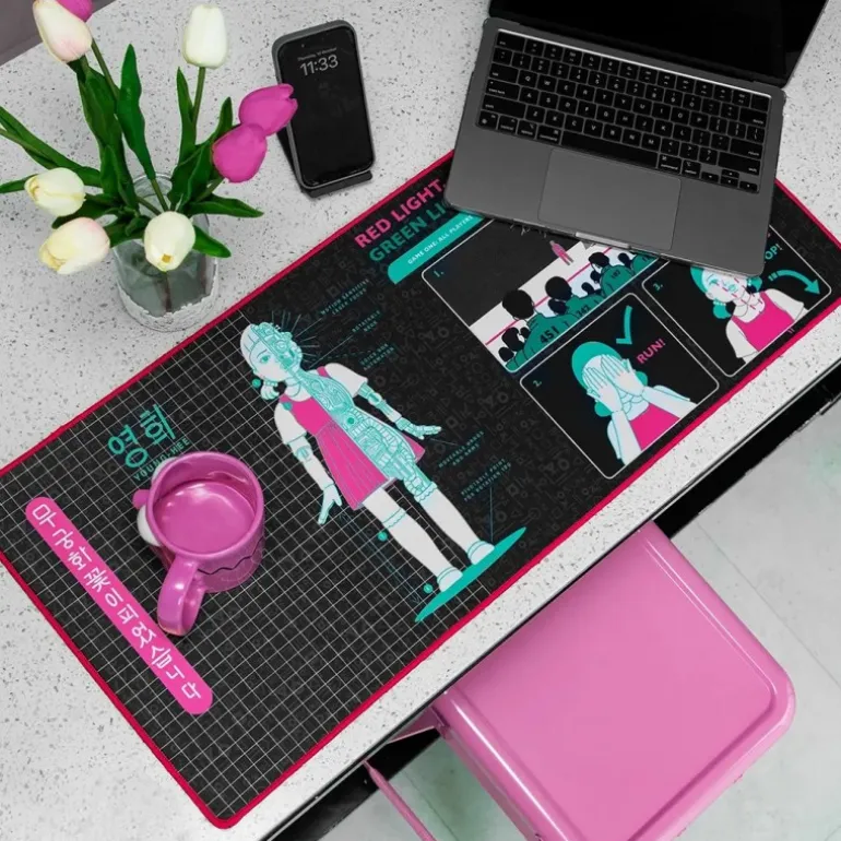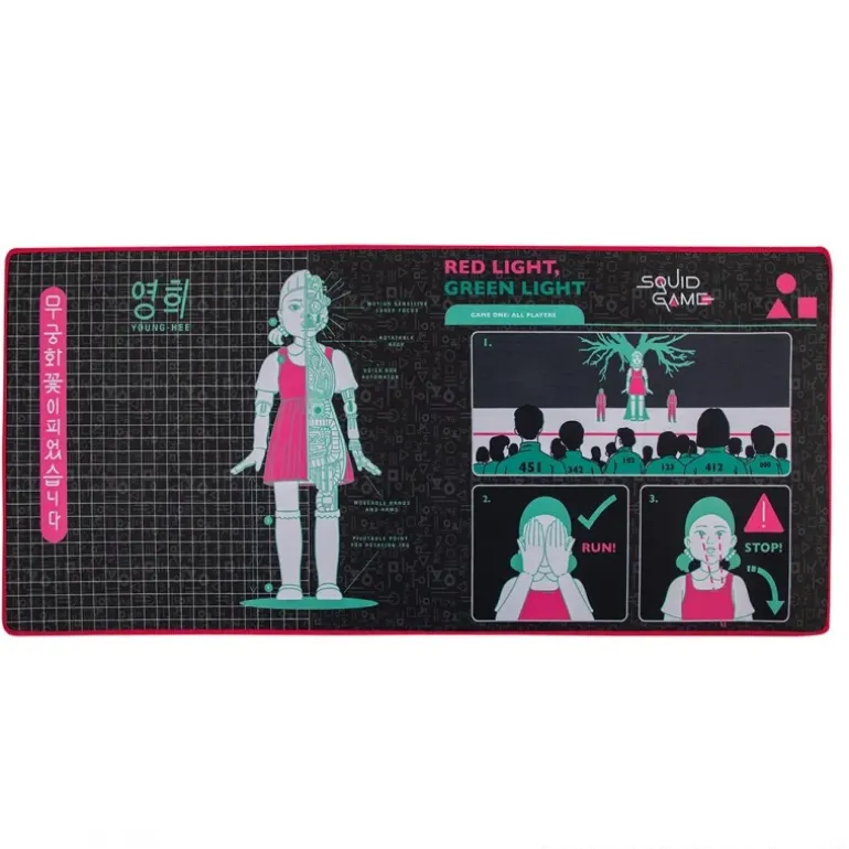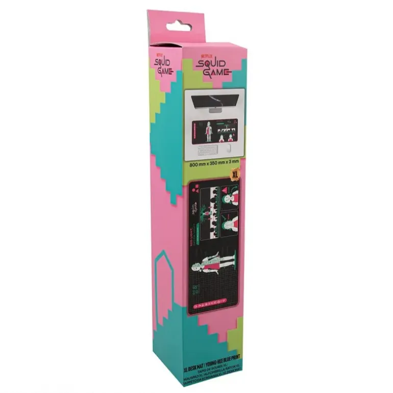 Descubre la alfombrilla de escritorio inspirada en Squid Game, un accesorio de colección imprescindible para los aficionados de esta popular serie de Netflix. Con un diseño llamativo que destaca el personaje de Young-Hee, esta alfombrilla fusiona tonos azulados y rosados para ofrecer una estética moderna y envolvente. Incluye detalles icónicos de la serie como «Red Light, Green Light», en un fondo negro que resalta sus colores. Fabricada en material de alta calidad, mide 39,5cm x 7,6cm x 7,6cm, ideal para cualquier escritorio, proporcionando no solo una apariencia única sino también protección para tus accesorios de oficina. Perfecta para añadir un toque especial a tu espacio de trabajo mientras te sumerges en el universo de El Juego del Calamar.