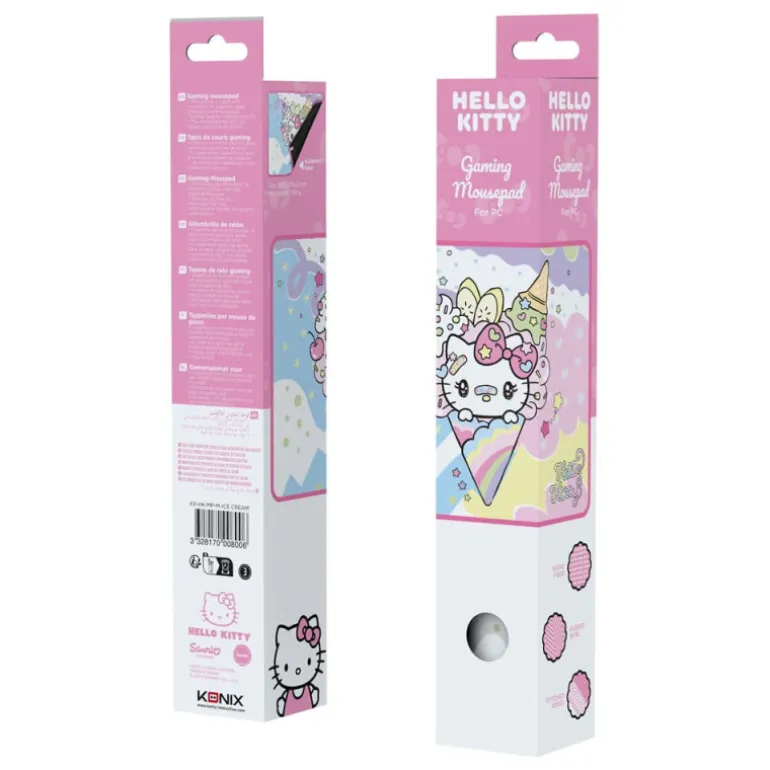 Descripción del Producto: La alfombrilla de ratón Hello Kitty presenta un diseño encantador con motivo de helado, donde la querida gatita aparece sobre un colorido fondo de cielo azul, rosa, amarillo y morado, adornado con estrellas y corazones. Las ilustraciones muestran a Hello Kitty dentro de un cono de helado, ofreciendo un toque divertido y juvenil.