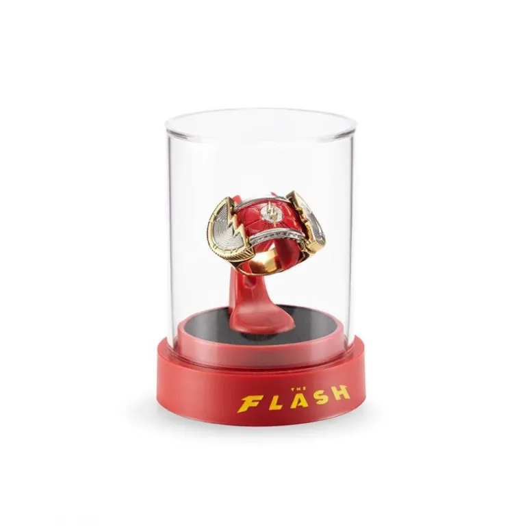 El anillo cuenta con un llamativo diseño en color rojo brillante, decorado con elementos dorados y plateados que recrean el icónico símbolo del rayo de Flash. La pieza central es un anillo robusto que refleja la velocidad y la energía del superhéroe. El exhibidor acompaña al anillo, destacando su elegancia con una base roja y una cúpula transparente que le otorga un aire de distinción en cualquier vitrina.