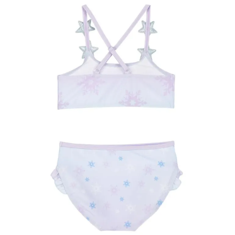 El sujetador presenta un hermoso diseño en tonos lilas, adornado con estrellas brillantes en los tirantes, haciendo eco de la mágica historia de Elsa. En la parte frontal, se destaca una imagen de la protagonista, que hará que cualquier niña se sienta como una verdadera reina del hielo. La parte inferior, también en tonos lilas, está decorada con copos de nieve, aportando un toque divertido y alegre.