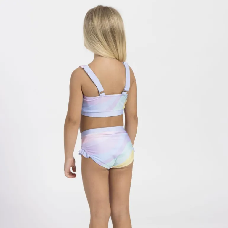 El bikini cuenta con un top de tirantes anchos y un diseño colorido que incluye a Stitch, el adorable personaje de Disney, en un fondo de suaves tonalidades pastel que combinan azul, amarillo y rosa. La parte inferior presenta un acabado con volantes, añadiendo un toque lúdico y femenino. Fabricado en un 85% de poliéster y un 15% de elastano, este bikini es el equilibrio perfecto entre durabilidad y elasticidad, proporcionando libertad de movimiento durante el juego y la natación.