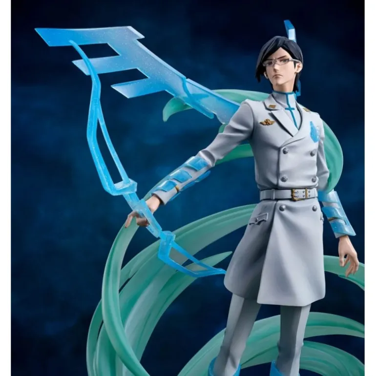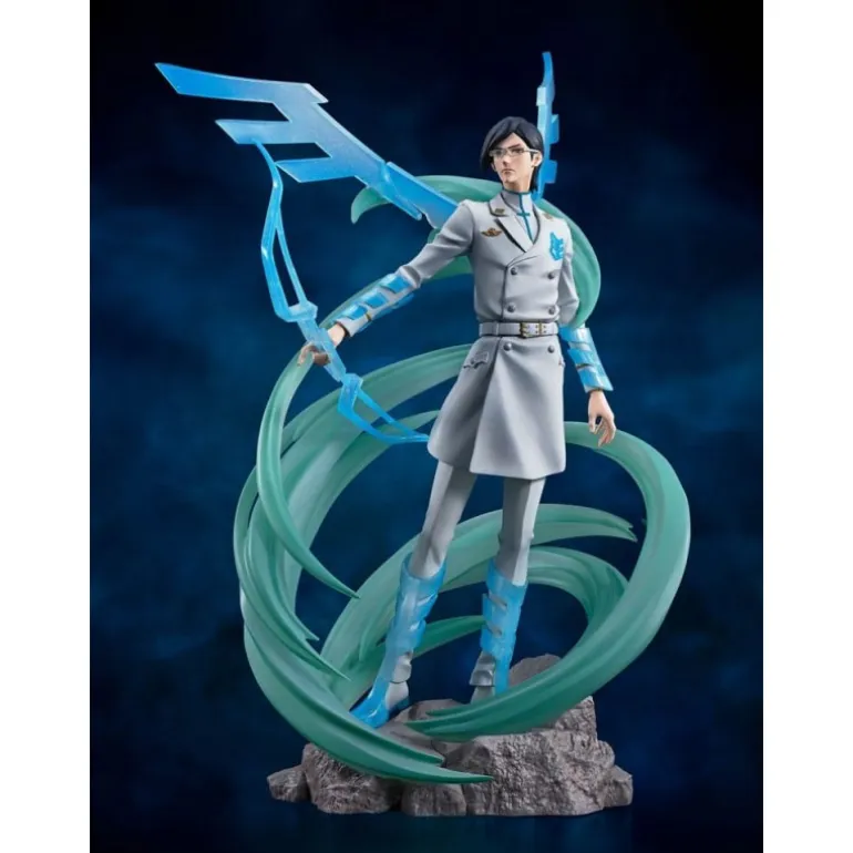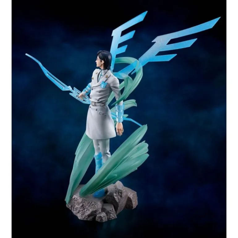 El diseño muestra a Uryu en su icónico traje gris claro, acompañado de impresionantes detalles en tonos azules translúcidos que simulan poderosos efectos de energía, resaltando la dinamismo de su postura. La figura, producida por Bandai, refleja una calidad superior, ofreciendo un acabado impecable que cualquier coleccionista apreciará.