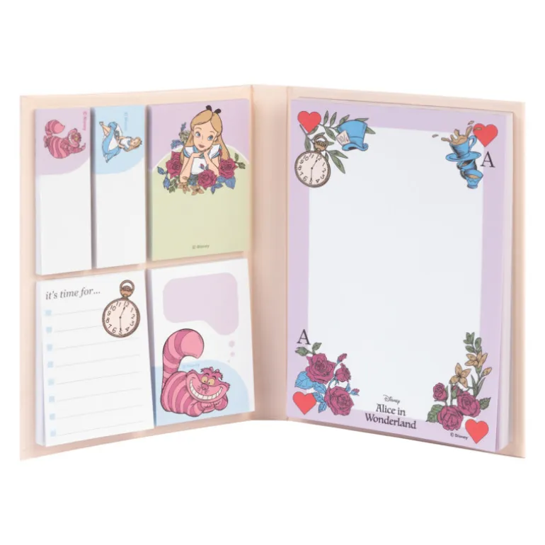 El bloc de notas incluye una variedad de 5 tipos de etiquetas adhesivas, que permiten personalizar y organizar las notas de una manera creativa y colorida. Estas etiquetas son perfectas para añadir un toque personal a documentos, cuadernos escolares o de trabajo, y son especialmente útiles para aquellos que disfrutan de la creatividad y la organización en su día a día. Las ilustraciones vibrantes y los motivos de «Alicia en el País de las Maravillas» inspiran no solo la creatividad, sino también la nostalgia de una historia atemporal.