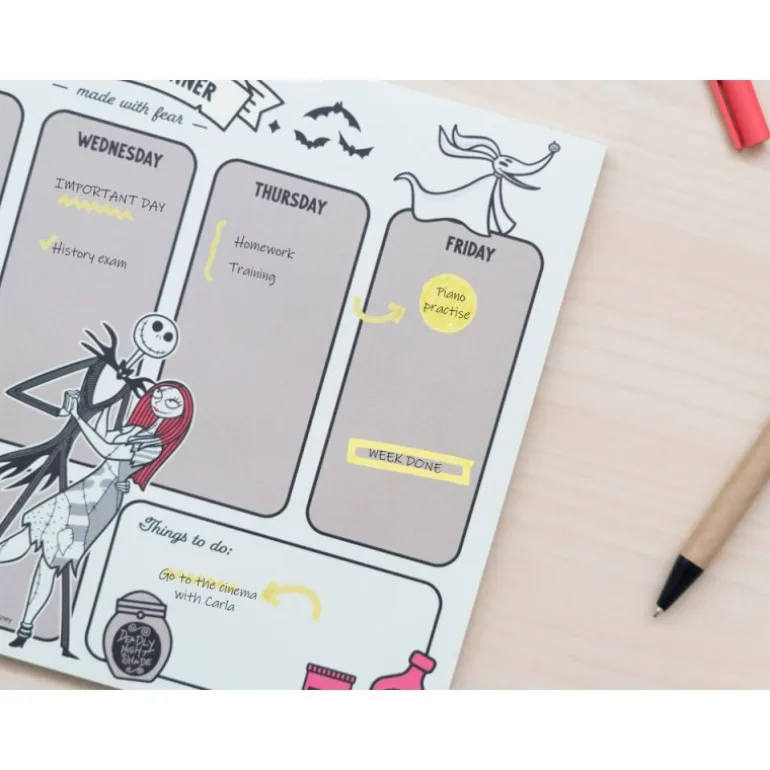 Un útil y colorido bloc diseñado como planificador de tareas, e inspirado una de las pelis más míticas del universo Tim Burton, Pesadilla Antes de Navidad. Te permitirá planificarte la semana para que llegues bien a todo.