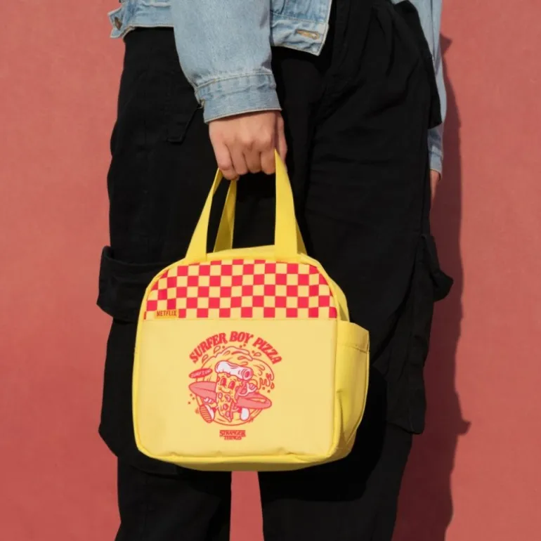 Descubre la Bolsa de Almuerzo Stranger Things, inspirada en la icónica serie de Netflix. Esta colorida bolsa, en vibrantes tonos amarillos y rojos, presenta un diseño de cuadros en la parte superior y una divertida ilustración de ‘Surfer Boy Pizza’. Está fabricada con poliéster de alta calidad y su interior está forrado con aluminio, ideal para mantener tus alimentos frescos y seguros. Con licencia oficial, es el regalo perfecto para los fans de Stranger Things que buscan un artículo práctico y original. ¡Hazte con esta bolsa y lleva el mundo de Hawkins a tu día a día!