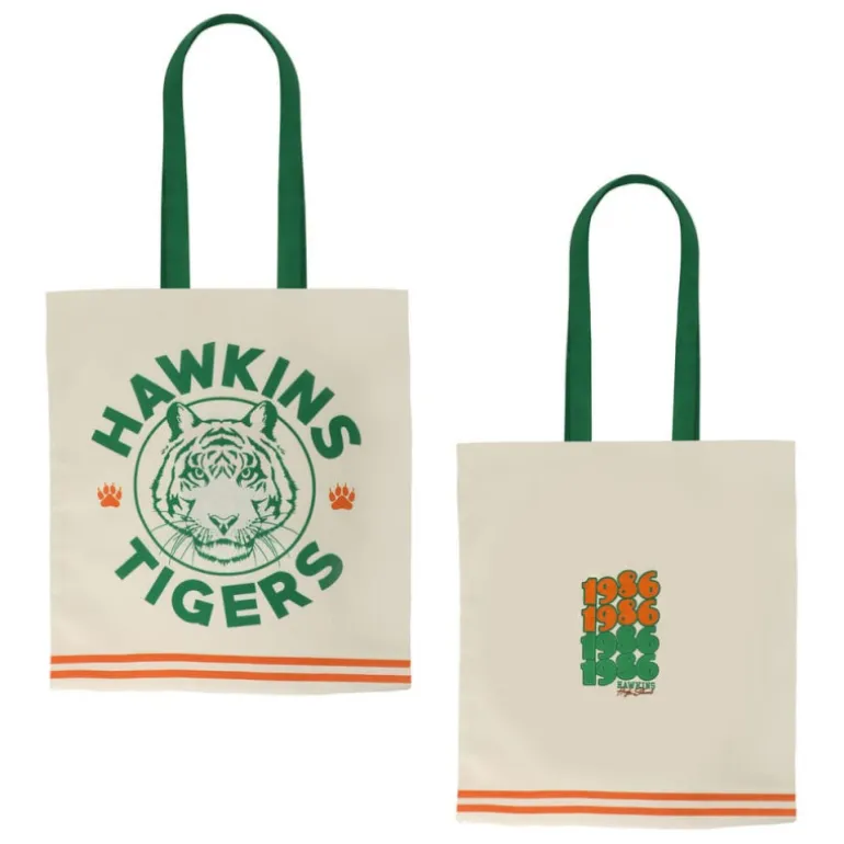Introduce un toque retro a tu día con la bolsa de tela Hawkins Tigers. Este producto con licencia oficial de Stranger Things combina a la perfección con la nostalgia de los años 80. Su diseño presenta un vibrante logo de los Hawkins Tigers en tonos verdes y naranjas sobre un fondo claro, evocando el espíritu de la serie de culto. El tigre en el centro del diseño y las patas en color naranja le añaden un toque distintivo y audaz.