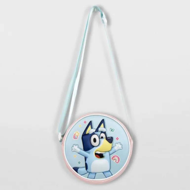 Descubre el encantador bolso 3D Bluey, un accesorio ideal para los más pequeños que adoran a este popular personaje. Su diseño circular y compacto presenta un llamativo gráfico de Bluey en relieve, mostrando el entusiasmo y alegría del personaje en un fondo azul con detalles de estrellas y coloridos elementos gráficos.