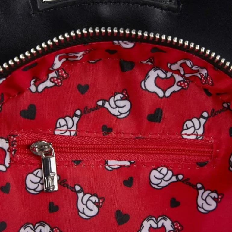 En su interior, se revela un forro rojo con detalles de las manos de Minnie formando corazones y la palabra ‘love’. Incluye una práctica cremallera interior para un almacenamiento seguro. La tira de cadena plateada aporta un toque moderno, fácil de combinar con cualquier atuendo.