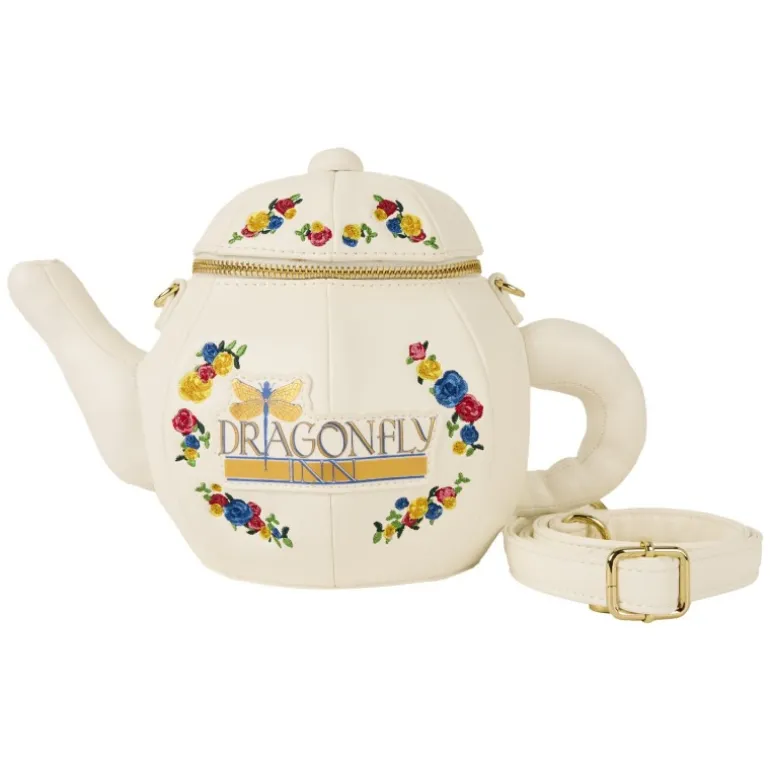 El bolso presenta un diseño en color crema delicadamente adornado con bordados de flores en tonos vivos como rojo, azul y amarillo. En el frontal, el logo de «Dragonfly Inn» muestra su relevancia y vínculo con la serie. El detalle del asa y el pico de la tetera le confieren un aspecto vintage y nostálgico, perfecto para los seguidores más fieles.