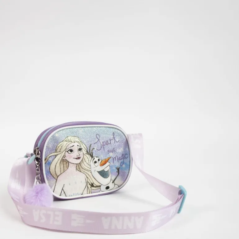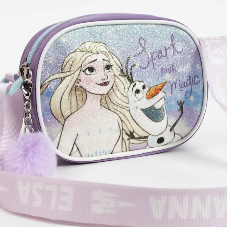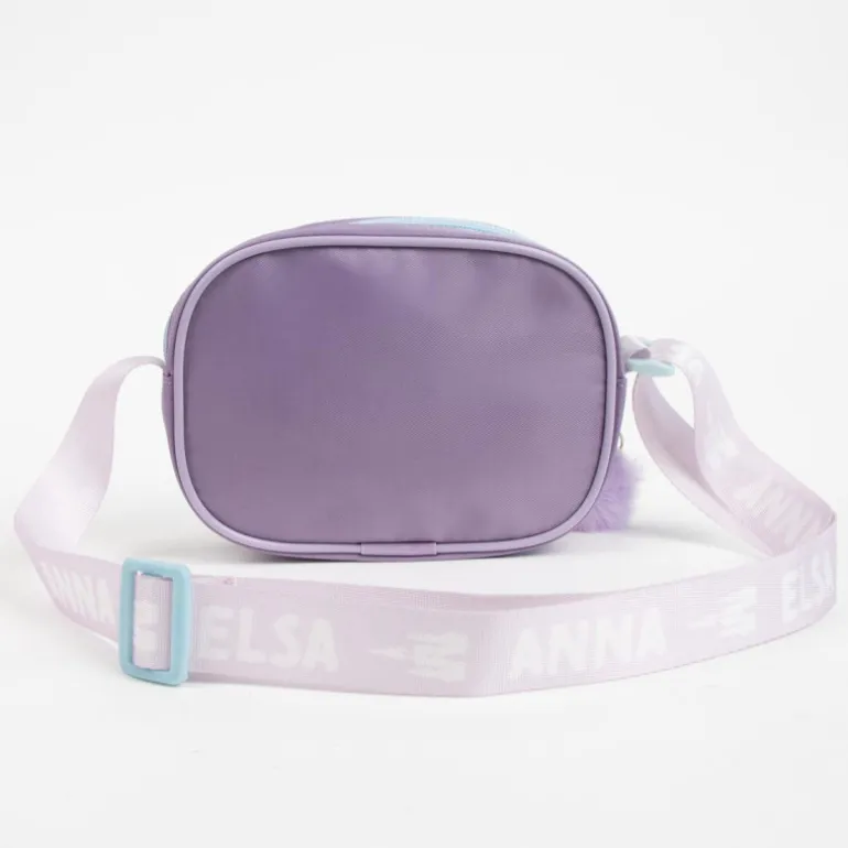 El bolso también incluye un encantador pompón en un tono lila suave que pende de un lateral, añadiendo un toque juguetón. La correa ajustable, decorada con las inscripciones de Anna y Elsa, asegura un ajuste cómodo y seguro para todas las edades.
