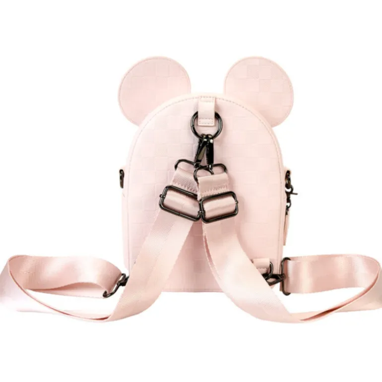 Descubre el encantador bolso mochila convertible de Minnie Mouse, una pieza única de Loungefly con diseño oficial de Disney. Este elegante accesorio presenta un delicado color crema con un patrón de cuadros, destacando unas orejas icónicas de Minnie en la parte superior y un lazo a juego que añade un toque distintivo.