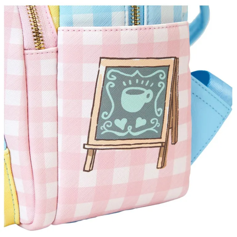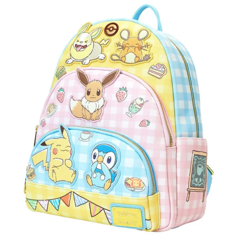 Descubre la mochila Loungefly Pokémon Café, un accesorio único y de alta calidad que combina estilo y funcionalidad para los amantes de Pokémon. Este bolso destaca por su diseño vibrante y detallado, con un fondo de cuadros en tonos pastel que incluye representaciones de tus personajes favoritos como Pikachu, Eevee y Piplup disfrutando de un ambiente de café. Decorado con detalles encantadores como fresas y dulces, el diseño es a la vez divertido y sofisticado.