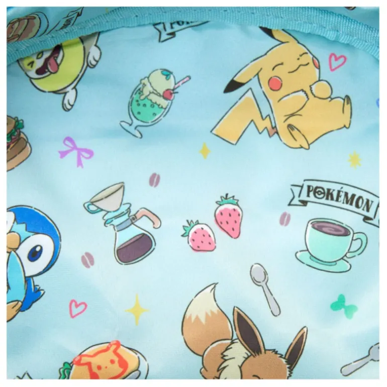 El interior del bolso sigue el tema del café Pokémon, cubierto con adorables ilustraciones que continúan la divertida narrativa del exterior. Además, los bolsillos laterales prácticos y el espacioso compartimiento principal facilitan la organización eficiente de tus artículos personales.