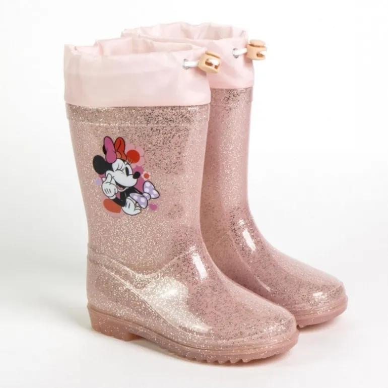 Dale un toque de diversión a los días lluviosos con estas encantadoras botas de lluvia de Minnie. Hechas de PVC, estas botas destacan por su color rosa brillante con destellos, proporcionando estilo y alegría a cada paso. El diseño incorpora una imagen de Minnie Mouse, perfecta para los pequeños fanáticos del universo Disney. Confeccionadas con una combinación de PVC y poliéster, ofrecen durabilidad y comodidad.