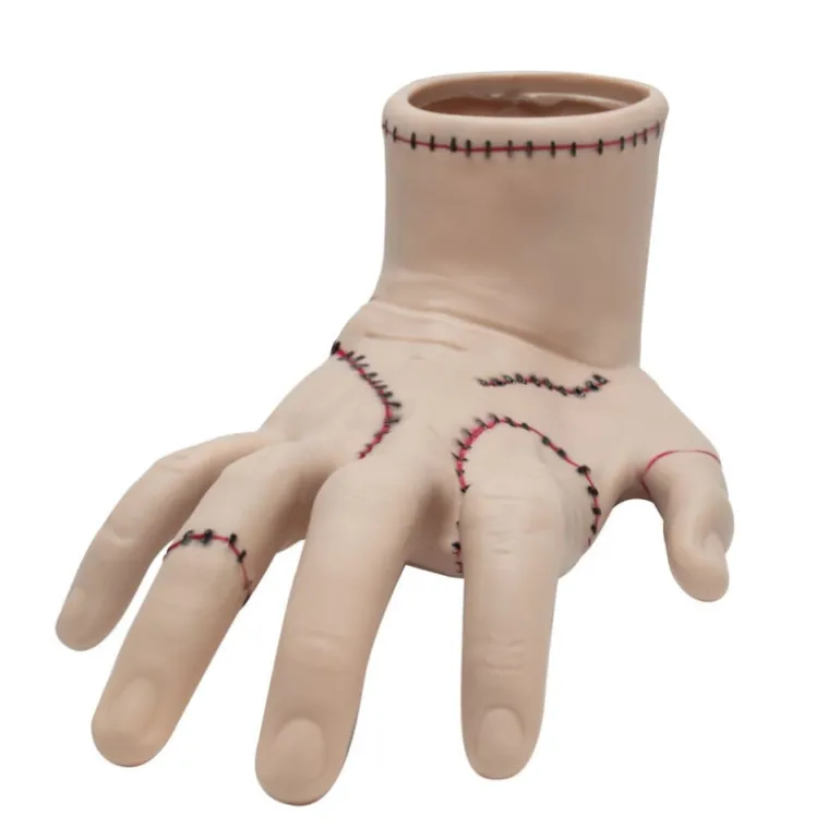 Transforma tu escritorio con este bote 3D para bolígrafos inspirado en Cosa (Thing) de la serie «Miércoles Addams». Este organizador de escritorio único presenta un diseño realista de una mano en color piel clara, finamente detallada con costuras negras y rojas que simulan un efecto de costura. La parte superior abierta permite almacenar bolígrafos, lápices y pinceles, manteniendo todo ordenado y accesible.