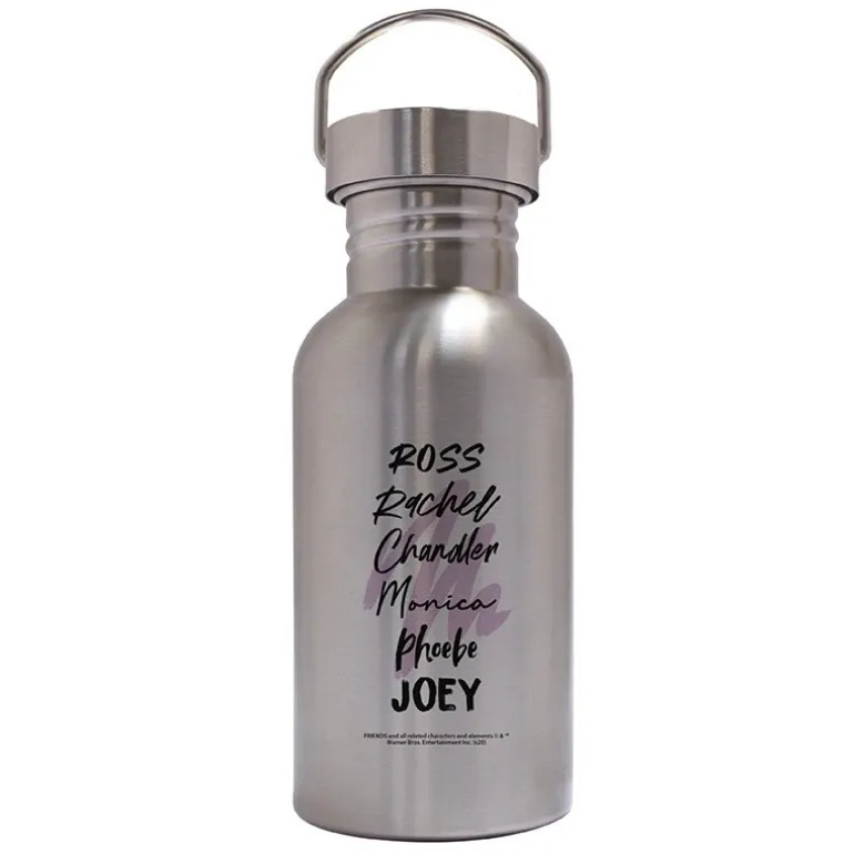 Con un acabado en el propio color del acero, elegante y resistente, la botella exhibe los nombres de los queridos personajes: Ross, Rachel, Chandler, Monica, Phoebe y Joey. La capacidad es de 500ml, como una botella peque de agua, perfecta para llevar a cualquier lugar.
