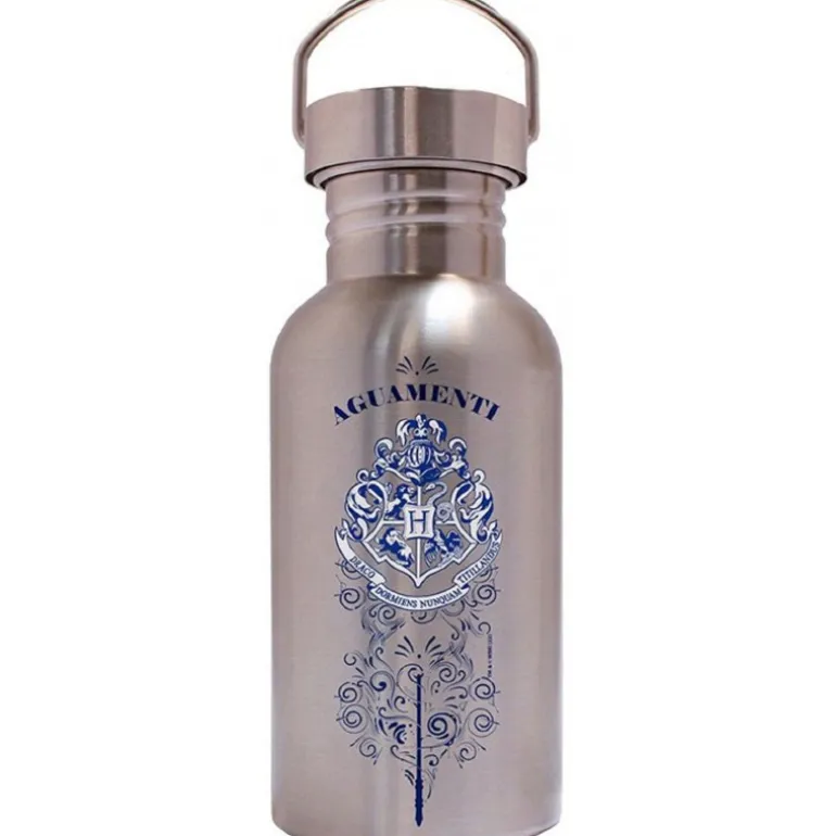 La botella presenta un acabado en acero inoxidable de color plateado que garantiza su durabilidad y resistencia. En el centro, destaca el icónico escudo de Hogwarts, acompañado por el hechizo «Aguamenti«, impresos en un elegante tono azul. Este diseño no solo es un homenaje a la saga, sino que también aporta un toque sofisticado.