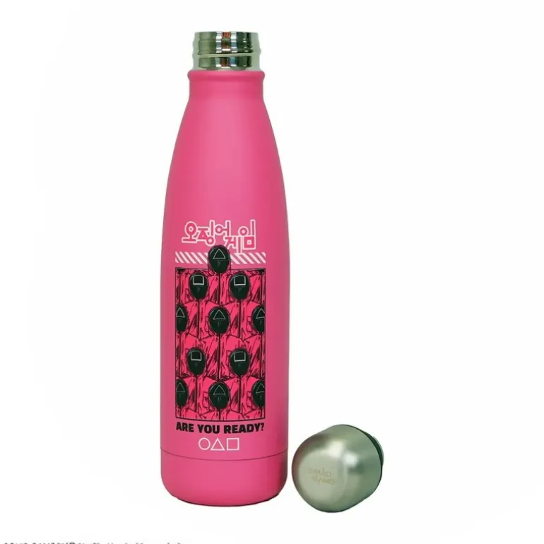 La botella isotérmica Guards inspirada en Squid Game es un accesorio esencial para los seguidores de esta serie de éxito. Con un vibrante color rosa, su diseño destaca por figuras geométricas negras representando a los icónicos guardias. En la parte superior, se puede leer «Are you ready?», una invitación directa a sumergirse en el universo de la serie.