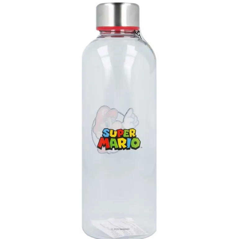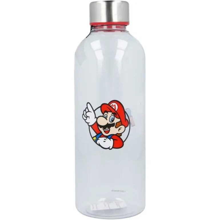 Se trata de una botella de gran calidad, fabricada en una combinación de plástico duro y acero inoxidable muy acertada, con un sistema de cierre perfecto para el uso cotidiano. Pero lo mejor su genial diseño, con una serigrafía de Mario, el mítico fontanero protagonista del juego, y el logo oficial de Super Mario por el otro lado.