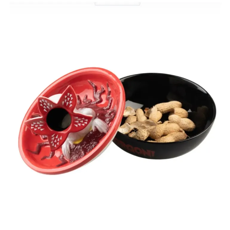 Este Bowl Snack Stranger Things Demogorgon es una pieza única para los amantes de la serie. Compuesto por un bowl y una tapadera decorada en 3D, el diseño incluye un orificio central que comunica con el bowl para almacenar las cáscaras y partes sobrantes de los aperitivos.