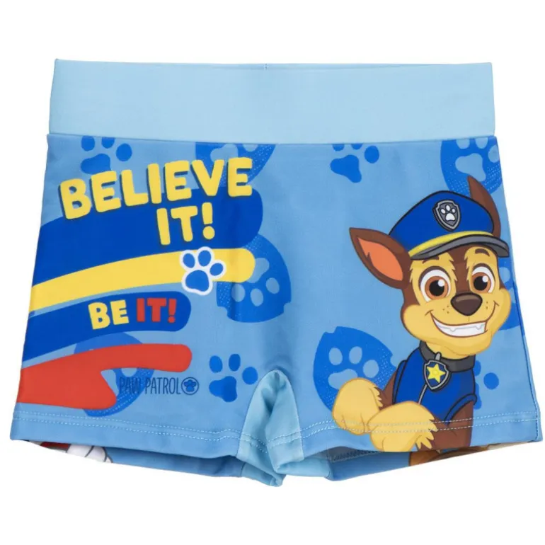 En la parte delantera, el boxer presenta a Chase, el famoso pastor alemán, con la frase «Believe it! Be it!» en letras llamativas de color amarillo y rojo, rodeada de huellas de patas que añaden un toque divertido. La parte trasera incluye las adorables imágenes de Rubble y Marshall, listos para acompañar a los más pequeños en sus aventuras acuáticas.