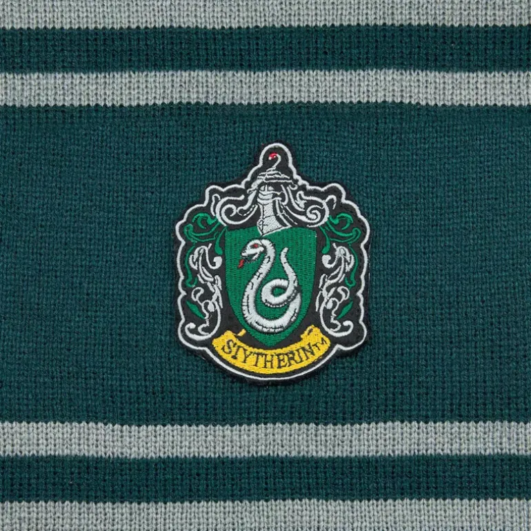Lo que hace que esta bufanda sea especial es su diseño en verde con rayas grises y el escudo de la casa Slytherin, una de las cuatro casas de Hogwarts. Además, su tela suave y cómoda te mantendrá cálido y confortable incluso en los días más fríos del invierno.