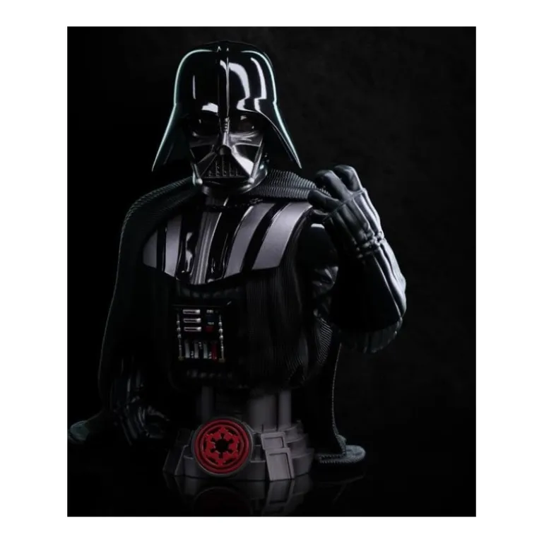 El busto presenta el característico casco negro brillante de Darth Vader, junto con su armadura detalladamente esculpida. La capa tiene un efecto de movimiento y los detalles del pecho y el cinturón están pintados con precisión para resaltar cada elemento. El fondo oscuro contrastante resalta aún más la figura, dándole una apariencia majestuosa y poderosa.