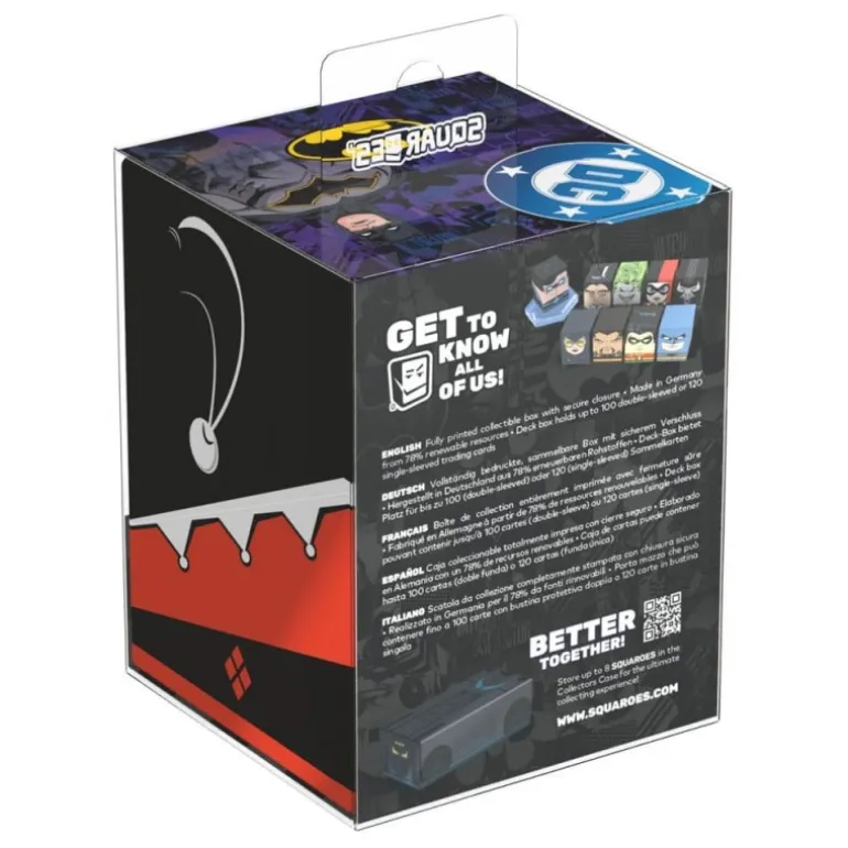 Hecho con un notable 78% de recursos renovables, el Harley Quinn Squaroe no solo es un deleite visual, sino también una elección responsable. Esta caja puede contener hasta 100 cartas con fundas dobles, brindando protección y estilo a tus cartas valiosas. Además, se adapta perfectamente en el Collectors Case de Squaroes, que se vende por separado, permitiéndote crear un sistema de almacenamiento organizado y elegante.