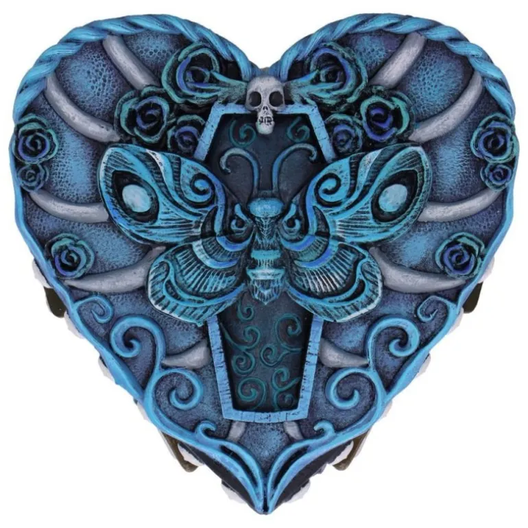 Esta exquisita caja de joyas inspirada en La novia cadáver es un accesorio perfecto para los fanáticos de la película. Pintada a mano, esta pieza de poliresina de 5 cm cuenta con un diseño detallado y romántico, destacando una delicada tapa en forma de corazón adornada con mariposas y delicadas rosas azules. Pequeñas calaveras rodean el borde, mientras la cita ‘With This Ring, I Ask You To Be Mine’ le añade un toque especial. Su fabricación por Nemesis Now garantiza la calidad y autenticidad del producto con licencia oficial. Es ideal para guardar pequeños tesoros o como un regalo único y personal.