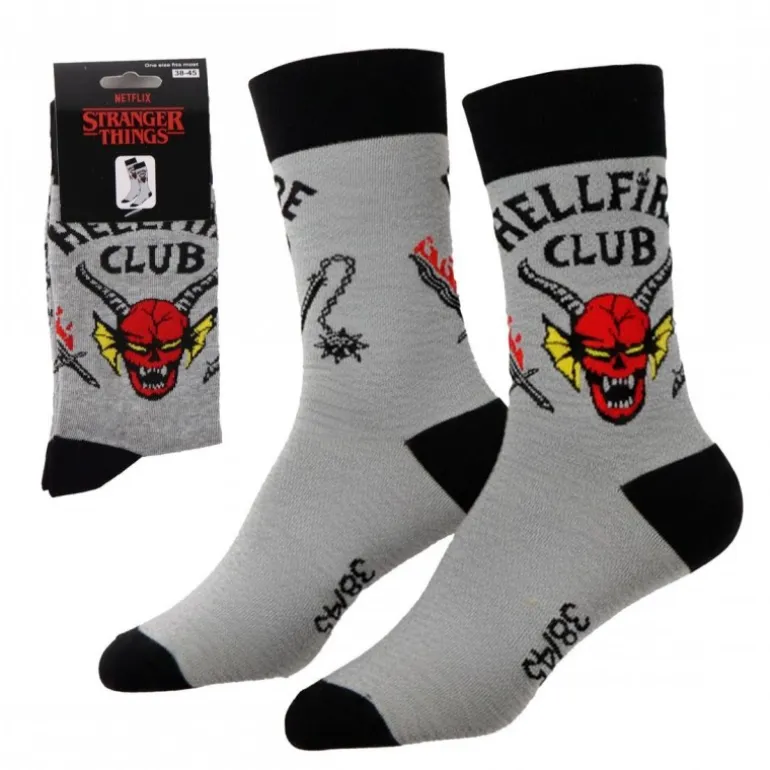 Descubre los calcetines Hellfire Club de Stranger Things, el complemento ideal para los verdaderos fans de esta emblemática serie de Netflix. Estos calcetines en color gris claro destacan por su diseño vibrante con el logo del Hellfire Club, caracterizado por un demonio rojo y detalles en negro y amarillo. Fabricados con un 86% de algodón, 12% de poliamida y 2% de elastano, ofrecen una comodidad y ajuste excepcionales.