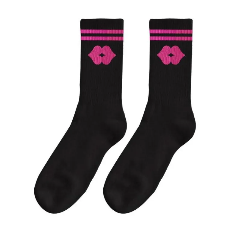 Descubre los calcetines oficiales del Morrete Fest, un homenaje a la cultura queer en La Rioja. Estos calcetines de color negro destacan por su diseño vibrante con un llamativo símbolo de labios en rosa que les aporta una personalidad única. Detallados con dos franjas horizontales en la parte superior también en rosa, combinan estilo y comodidad.
