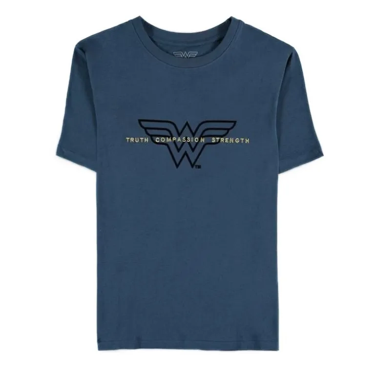 Se trata una camiseta con un diseño realmente elegante, en un color azul oscuro de esos que pegan con casi cualquier prenda, y con el mítico logo de Wonder Woman en grande, además de tres palabras que definen perfectamente a Wonder Woman: Truth, Compassion, Strength (Verdad, Compasión, Fuerza). Es una camiseta entallada especialmente para chica, así que te quedará genial.