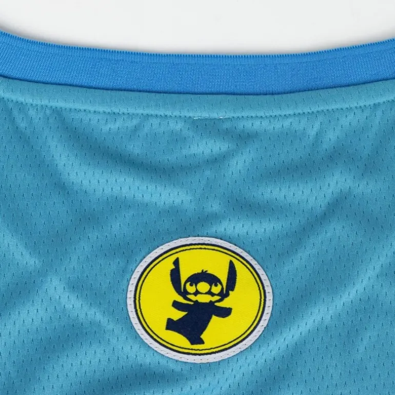 Descubre la camiseta de baloncesto inspirada en Stitch, perfecta para los amantes de Disney y los deportes. Esta prenda destaca por su vibrante color azul celeste, complementado con paneles laterales en azul más oscuro y líneas amarillas que le añaden un toque dinámico.