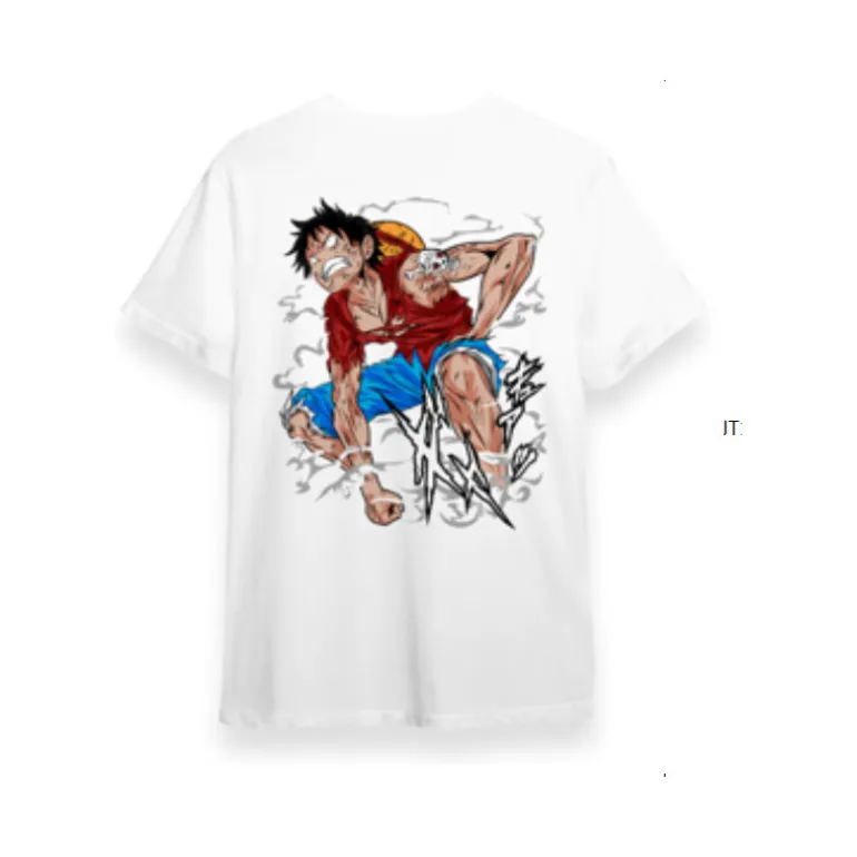 Esta camiseta de alta calidad, fabricada en Japón, es el regalo perfecto para los amantes de One Piece y del personaje Luffy. Confeccionada con 200 gramos de algodón puro, esta pieza única destaca por su patrón oversize y su diseño de Luffy listo para la batalla en un fondo blanco.