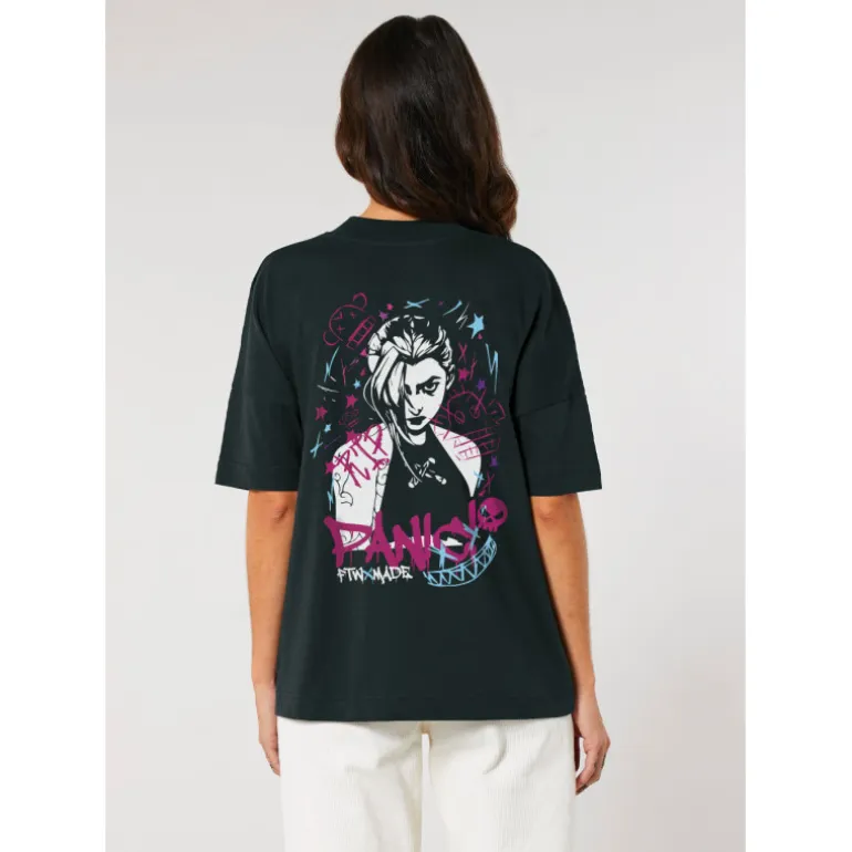 La camiseta de Jinx de Arcane es un producto de alta calidad que destaca por su textura suave y resistente. Confeccionada con 200 gramos de 100% algodón, garantiza una gran comodidad y durabilidad.