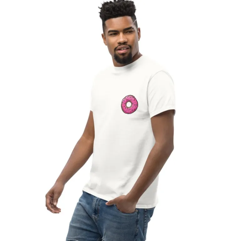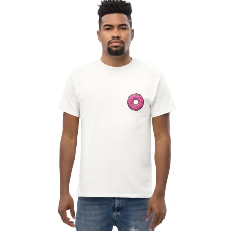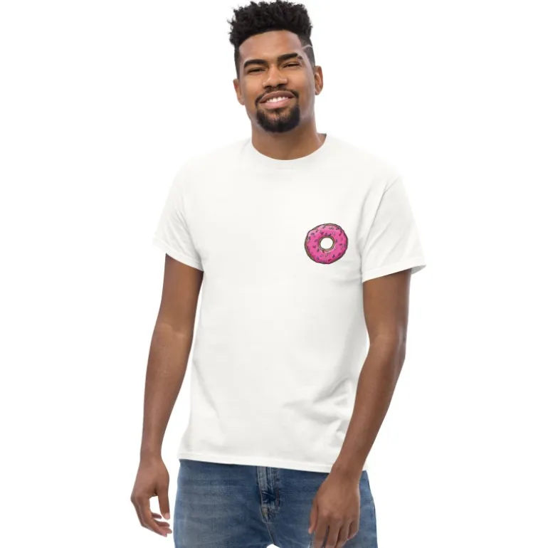 Su atractivo visual y su referencia cultural la convierten en un producto coleccionable para los fans, lo que aumenta su valor en el mercado. Camiseta blanca con detalle de rosquilla rosa.