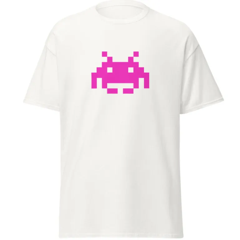 Descubre la camiseta definitiva para los amantes de los videojuegos retro con esta impresionante prenda de Space Invaders. Presenta un diseño icónico de un marcianito en color rosa vibrante en el centro del pecho, capturando la esencia clásica de los arcades. El fondo blanco de la camiseta resalta el diseño pixelado, añadiendo un toque de nostalgia y estilo.