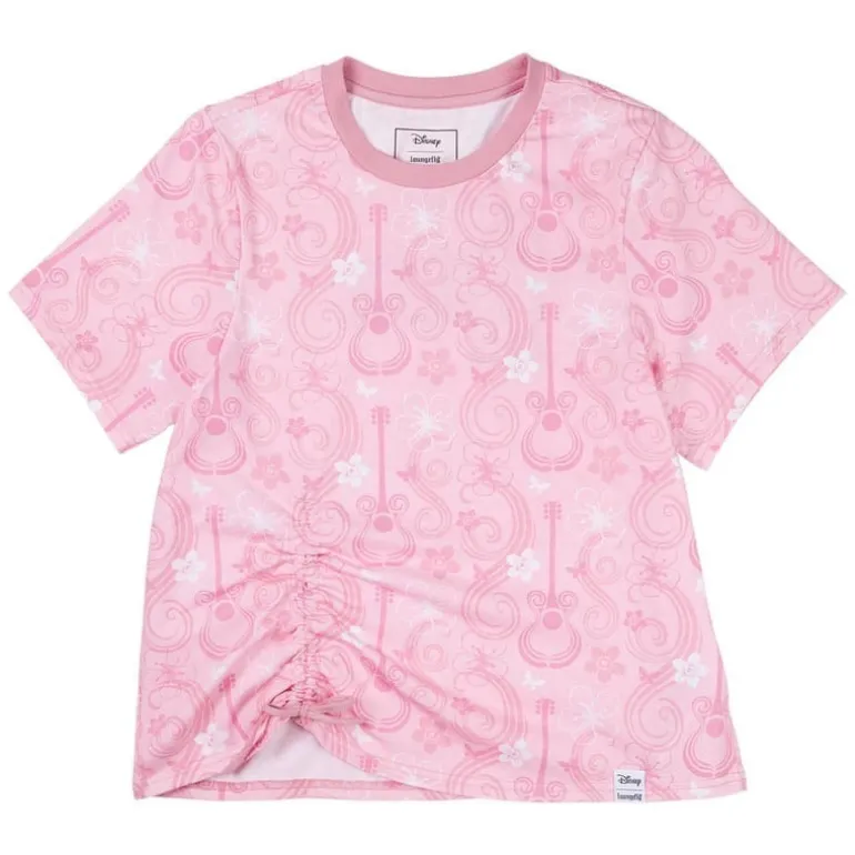 Descubre la camiseta unisex de Hannah Montana de Disney by Loungefly. Esta prenda, hecha de 100% algodón jersey, garantiza comodidad y calidad superior. Su diseño presenta un encantador estampado en color rosa con motivos de guitarras y flores, perfecto para los fans de Disney y Hannah Montana.