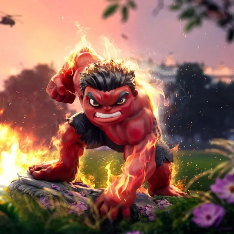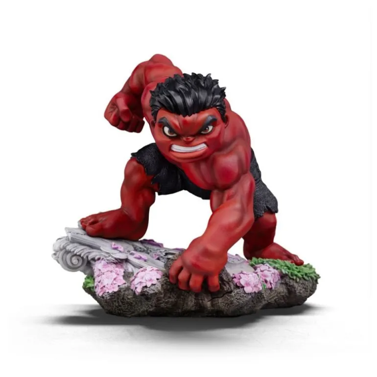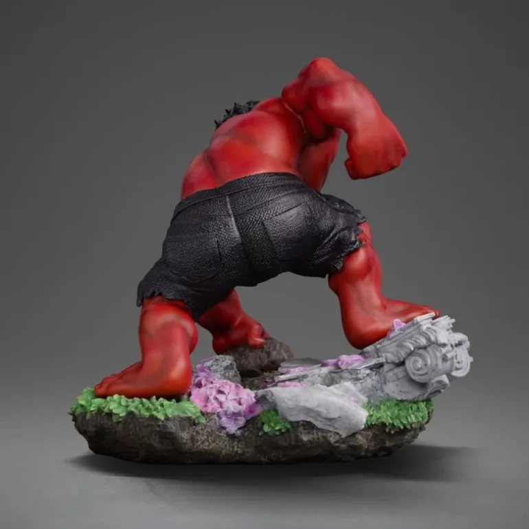 La figura presenta a Red Hulk en una postura dinámica, listo para la acción, con un acabado en color rojo vibrante y detalles en su cabello negro y pantalones cortos grises. La base decorativa simula un terreno rocoso adornado con hojas verdes y flores rosas, añadiendo un toque de realismo y contraste al conjunto.