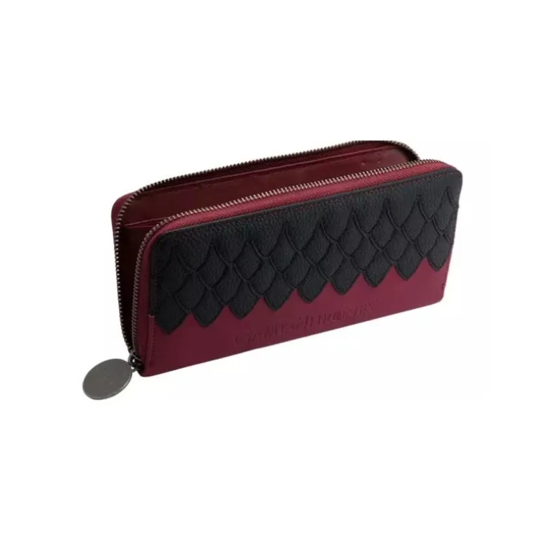 Con un diseño en tonos rojo burdeos y negro, esta billetera presenta un patrón que recuerda a las escamas de un dragón, inspirado en el símbolo de los Targaryen. En su parte frontal, el logo de Game of Thrones está discretamente grabado, añadiendo un toque de autenticidad y elegancia.