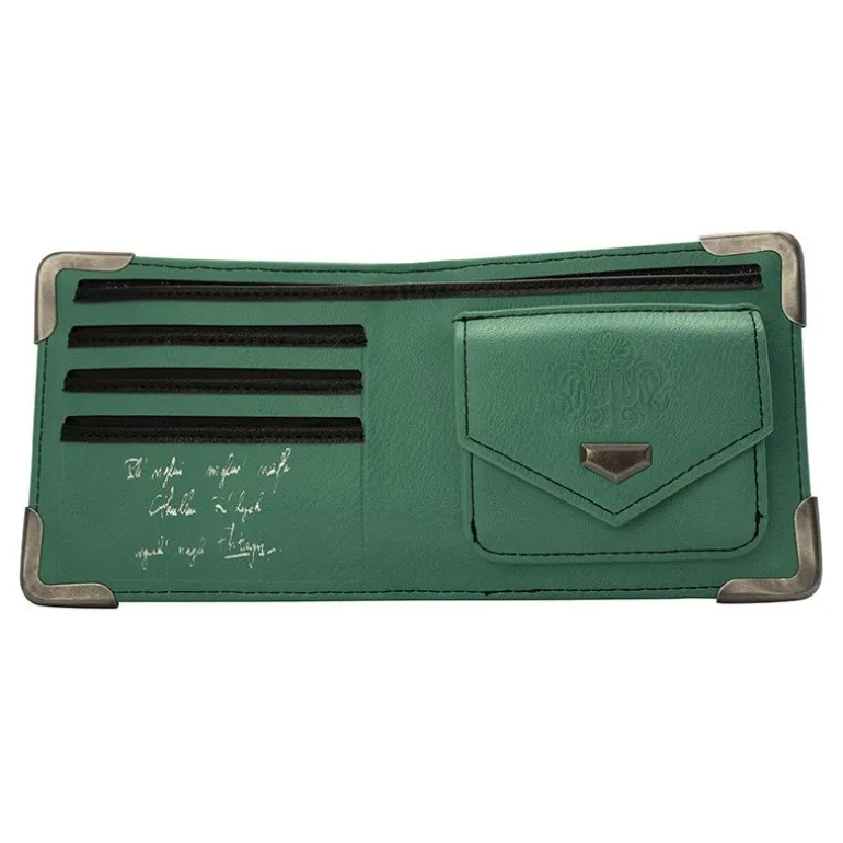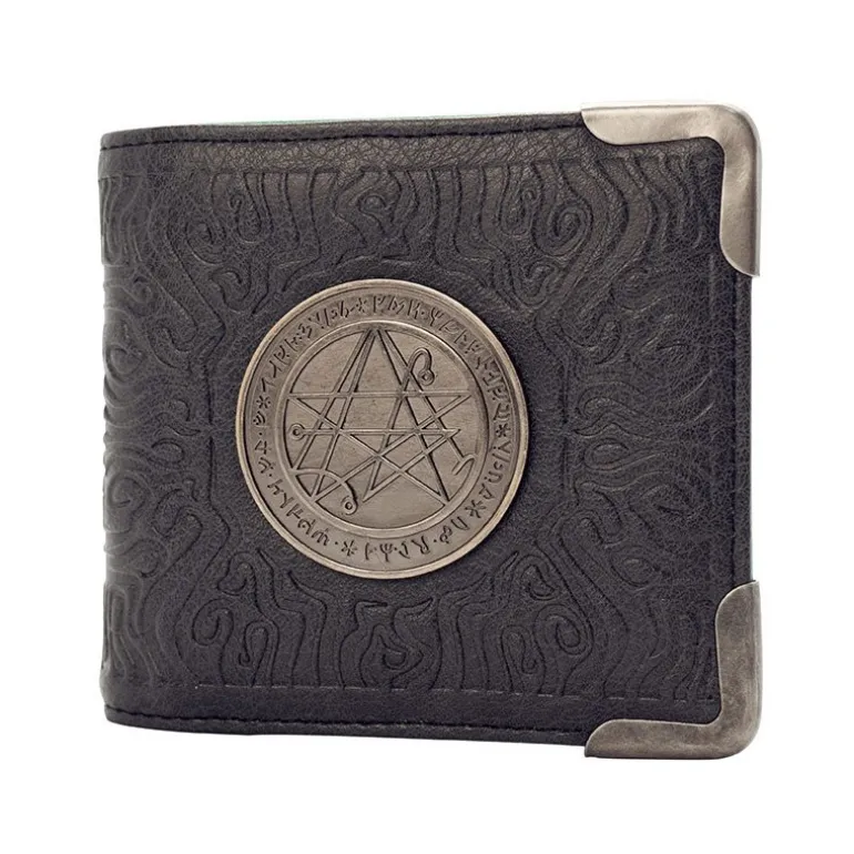 Mide aproximadamente 11 x 9,5 cm cuando está cerrada y tiene un fantástico diseño, protagonizado por el famoso símbolo del Necronomicón, en este caso reproducido en metal, que combina estupendamente con la superficie de piel sintética negra, sin usar materiales de origen animal en su fabricación. Por dentro tiene varios compartimentos, ideal para billetes, tarjetas… Pero también un compartimento cerrado para monedas, en el que aparece en relieve el dibujo de esta criatura gigantesca con forma de calamar: Cthulhu.