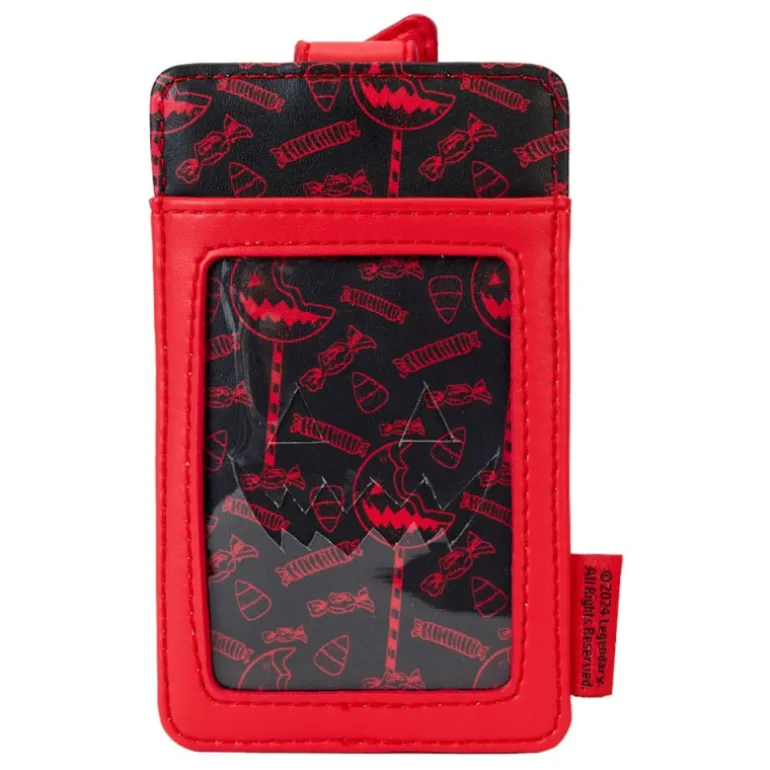 El tarjetero, principalmente en tonos negro y rojo, cuenta con un llamativo diseño en la parte frontal que simula un caramelo gigantesco con el texto «Hollie-ho«. Las figuras decorativas en relieve le añaden un toque especial, perfecto para los amantes del horror y lo retro.