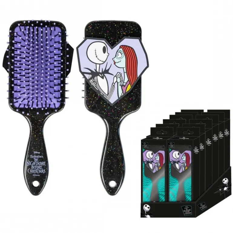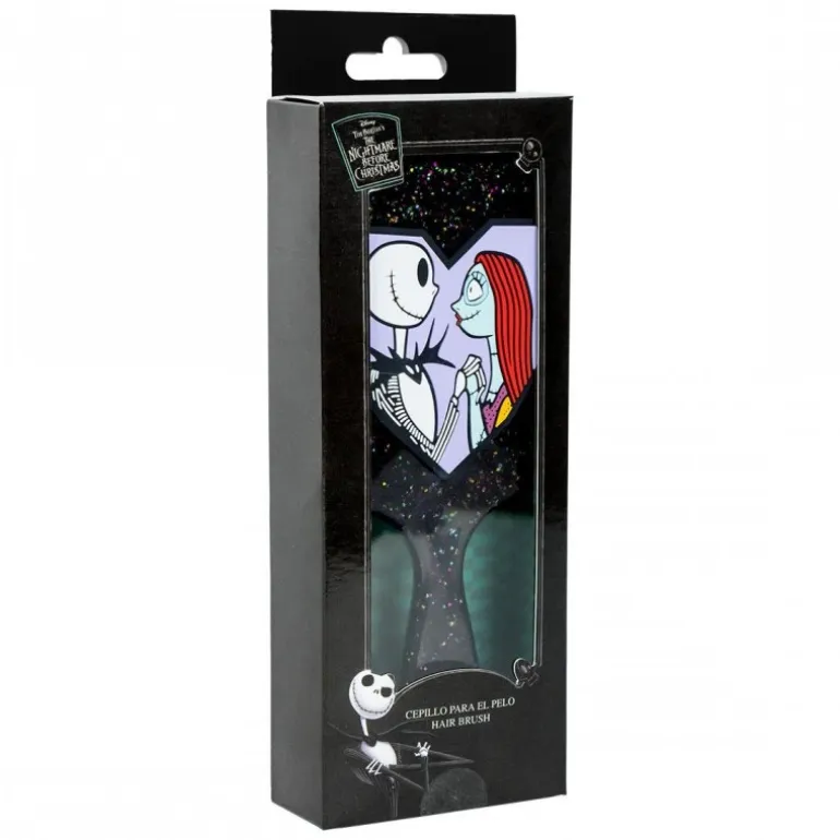 Este cepillo rectangular es un homenaje perfecto para los amantes de Nightmare Before Christmas. Con un diseño encantador en el que aparecen Jack Skellington y Sally, este cepillo no solo embellece tu rutina diaria, sino que también añade un toque de magia a tu tocador. El cuerpo del cepillo está fabricado en plástico ABS negro con acabado brillante y detalles de purpurina que evocan un cielo estrellado. Sus cerdas flexibles en color violeta están diseñadas para desenredar suavemente el cabello sin romperlo. Es una opción ideal tanto para coleccionistas como para quienes desean añadir un toque único a su cuidado personal diario. El cepillo viene en una elegante caja de presentación, perfecta para regalo.