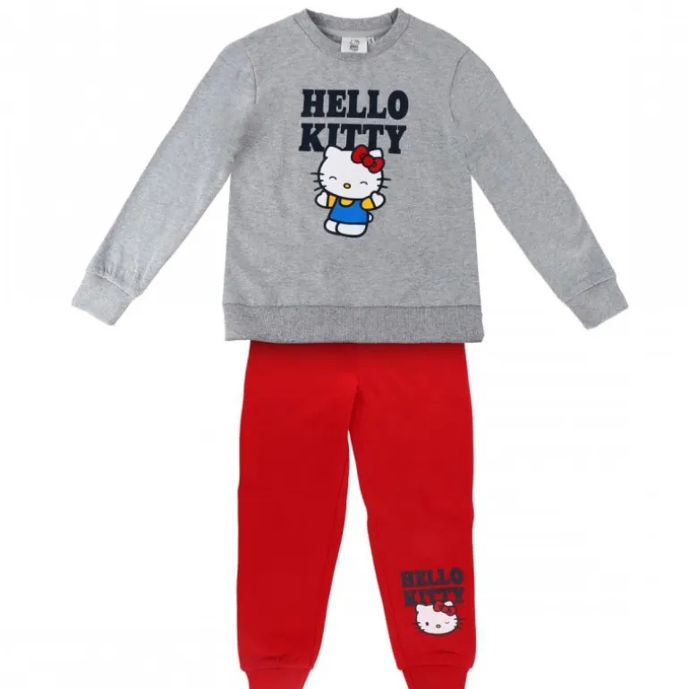 Este encantador chándal de Hello Kitty para niñas de 6 a 12 años es perfecto para las pequeñas admiradoras del popular personaje. La sudadera gris presenta un diseño clásico con un gran estampado de Hello Kitty en el centro, acompañado por su nombre en letras negras destacadas. Los pantalones en rojo vibrante complementan perfectamente la parte superior, con otro pequeño estampado de Hello Kitty y su nombre en la pernera. Fabricado con una cómoda mezcla de 60% algodón y 40% poliéster, este conjunto ofrece calidez y suavidad, ideal para el día a día o actividades deportivas.