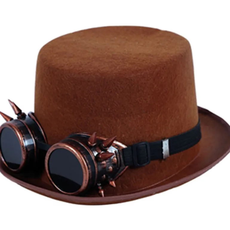 Chistera o Sombrero de Steampunk con gafas de púas. Perfecto en fiestas del terror como Halloween. El Steampunk es una estética de origen e inspiración Victoriano mezclado con tecnología futurista, este movimiento creció bastante a partir de que se escribiesen novelas como La guerra de los mundos o La máquina del tiempo de H.G. Wells. ¡Compra en un e-commerce como y apoya el comercio español!