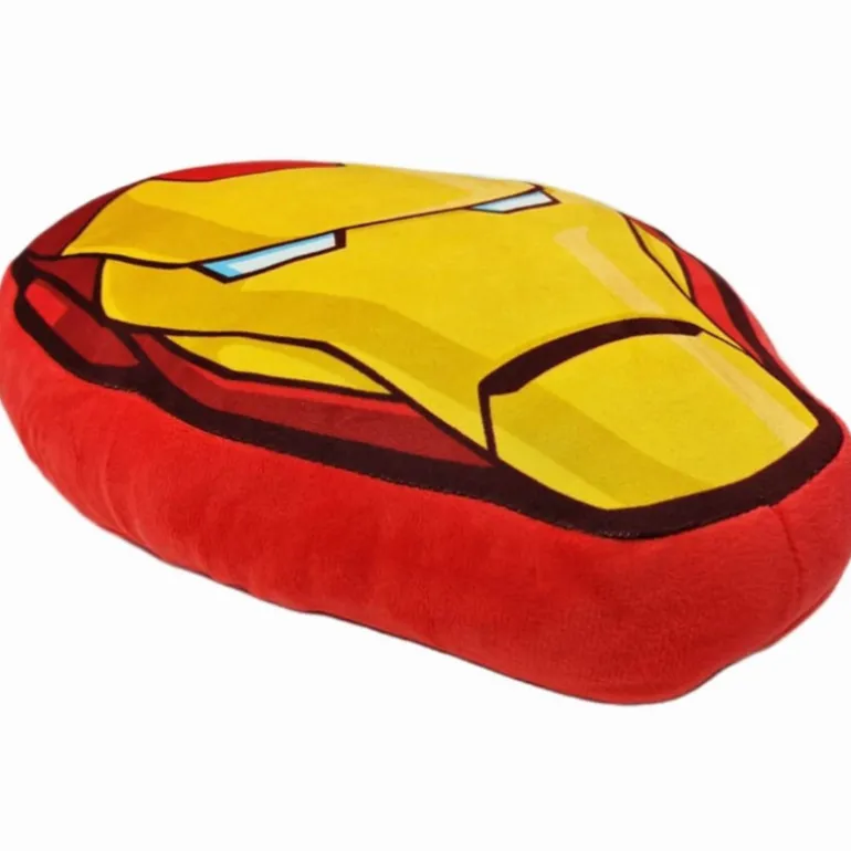El cojín presenta un intenso color amarillo en el centro, representando el casco de Iron Man, rodeado por un borde de color rojo, típico del traje del superhéroe. Además, los detalles en negro añaden profundidad y definición al diseño, mientras que los ojos blancos le aportan un toque realista y heroico.