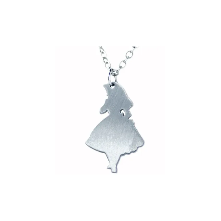 Se trata de un elegante colgante de acero, que destaca por una pieza principal con la forma de la silueta de Alicia, con ese mítico vestido azul que a todos nos viene a la mente nada más pensamos en ella. Está fabricado en acero y cuenta con unos acabados de gran calidad.