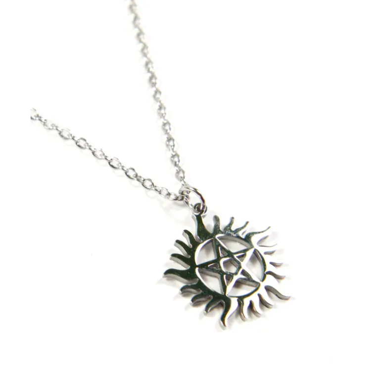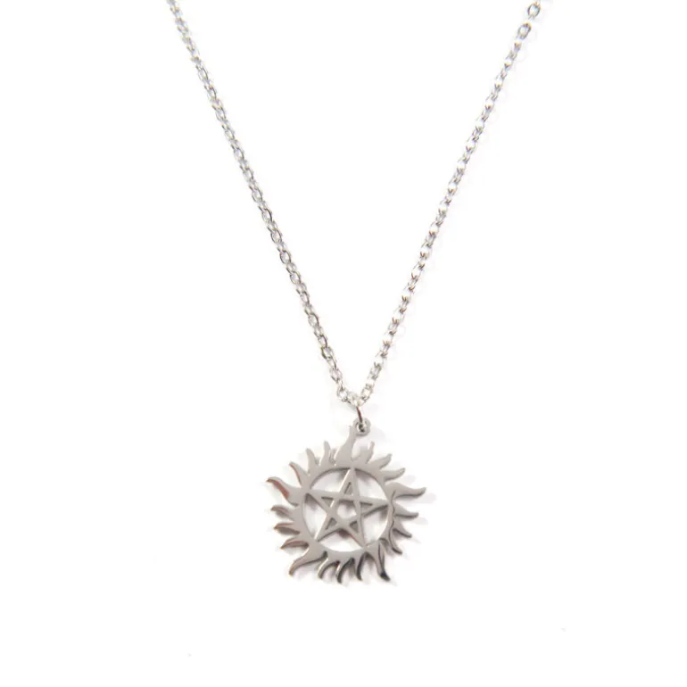 El colgante de acero del símbolo anti posesión de Supernatural es un producto de alta calidad que forma parte de la serie de joyería inspirada en la famosa serie de televisión. Con un diámetro de 20mm, este colgante presenta el símbolo anti-posesión tan emblemático de la serie, mientras que su cadena de 58cm lo hace adecuado para ser utilizado en el día a día.